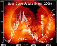 What's going on? Hathaway explains: "We have two solar cycles in progress at the same time. Solar Cycle 24 has begun (the first new-cycle spot appeared in January 2008), but Solar Cycle 23 has not ended."