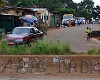 A wall near a road is covered on October 22, 2009 with the slogan "Down With Dadis," in the Mototo neighborhood of Conakry. More than 150 people were massacred in Guinea on September 28, according to the United Nations, but dozens of families are still looking for relatives who went missing that day. Some of these people are believed to be held at the Alpha Yaya military base that serves as headquarters for the leader of Guinea's military junta, Captain Moussa Dadis Camara. Photo courtesy AFP.
