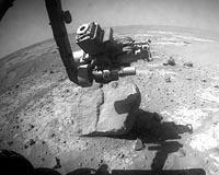 Pasadena CA (JPL) Aug 09, 2010 Opportunity took advantage of some exposed rock outcrop to perform an in-situ (contact) science campaign to sample the surface at roughly one-kilometer (0.62-mile) intervals. On Sol 2315 (July 29, 2010), the rover performed a short 16-meter (52-foot) drive to position herself on exposed outcrop for a weekend science campaign. On Sol 2317 (July 31, 2010), the robotic arm (instrument deployment device, or IDD) was moved first, so the panoramic camera (Pancam) could image the work volume. Then the IDD collected a microscopic imager (MI) mosaic of a surface target, called Valparaiso, followed by the placement of the alpha particle X-ray spectrometer (APXS) on the same target for integration. More remote sensing science was collected on the following sols. On Sol 2320, Opportunity resumed the drive toward Endeavour crater with a 71-meter (233-foot) drive to the southeast. As of Sol 2320 (Aug. 3, 2010), solar array energy production was 529 watt-hours with atmospheric opacity (Tau) of 0.415 and the solar array dust factor of 0.744. Total odometry is 21,948.13 meters (21.95 kilometers, or 13.64 miles).