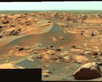 Sol 1648 (Sept. 12, 2008): Opportunity stowed the robotic arm and began driving toward the dust patch. Just before and after ending the drive, Opportunity took images with the hazard-avoidance and navigation cameras, respectively. The rover acquired a 4-by-1 panel of images, called the "Bagnold mosaic," with the panoramic camera.