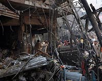 Flames reached out of burning wreckage and smoke billowed over the collapsed rubble of a mosque and three buildings, where rescue workers picked charred bodies out of smouldering debris and gathered human flesh in plastic bags.