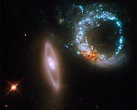 Baltimore MD (SPX) Oct 31, 2008 NASA's Hubble Space Telescope is back in business. Just a couple of days after the orbiting observatory was brought back online, Hubble aimed its prime working camera, the Wide Field Planetary Camera 2 (WFPC2), at a particularly intriguing target, a pair of gravitationally interacting galaxies called Arp 147. The image demonstrated that the camera is working exactly as it was before going offline, thereby scoring a "perfect 10" both for performance and beauty. The two galaxies happen to be oriented so that they appear to mark the number 10. The left-most galaxy, or the "one" in this image, is relatively undisturbed apart from a smooth ring of starlight. It appears nearly on edge to our line of sight. The right-most galaxy, resembling a zero, exhibits a clumpy, blue ring of intense star formation. The blue ring was most probably formed after the galaxy on the left passed through the galaxy on the right. Just as a pebble thrown into a pond creates an outwardly moving circular wave, a propagating density wave was generated at the point of impact and spread outward. As this density wave collided with material in the target galaxy that was moving inward due to the gravitational pull of the two galaxies, shocks and dense gas were produced, stimulating star formation. The dusty reddish knot at the lower left of the blue ring probably marks the location of the original nucleus of the galaxy that was hit. Arp 147 appears in the Arp Atlas of Peculiar Galaxies, compiled by Halton Arp in the 1960s and published in 1966. This picture was assembled from WFPC2 images taken with three separate filters. The blue, visible-light, and infrared filters are represented by the colors blue, green, and red, respectively. The galaxy pair was photographed on October 27-28, 2008. Arp 147 lies in the constellation Cetus, and it is more than 400 million light-years away from Earth. Related Links Hubble Space Telescope Space Telescope News and Technology at Skynightly.com