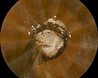 This is an image of Mars taken from orbit by the Mars Reconnaissance Orbiter's Mars Color Imager (MARCI). The Red Planet's polar ice-cap is in the middle of the image. Captured in this image is a 37,000 square-kilometer (almost 23,000 miles) dust storm that moved counter-clockwise through the Phoenix landing site on Oct 11, 2008, or Sol 135 of the mission. Viewing this image as if it were the face of a clock, Phoenix is a shown as a small white dot, located at about 10 AM. The storm, which had already passed over the landing site earlier in the day, is located at about 9:30 AM. NASA/JPL-Caltech/Malin Space Science Systems