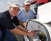 GTRI researchers Gary Gray (left) and David Price (right) insert a USB drive loaded with mission parameters into an imaging system they developed to estimate the number of refugees after a natural disaster and assess the need for health and humanitarian services. Georgia Tech Photo: Gary Meek.