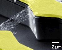 "It's hard to find the sample because it's very, very small," said Jiamin Xue, a doctoral student in LeRoy's lab and the paper's leading author. "Once we find it, we put it between two gold electrodes so we can measure the conductance."