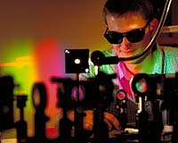 Jason McKinney, a former visiting assistant professor in Purdue's School of Electrical and Computer Engineering, works with equipment that produces pulsing laser light in the university's Ultrafast Optics and Optical Fiber Communications Laboratory. Researchers in the lab recently have shown how to finely control the spectral properties of ultrafast light pulses, a step toward creating advanced sensors, more powerful communications technologies and more precise laboratory instruments. McKinney is now an engineer at the Naval Research Laboratory. (Purdue Engineering Communications Office photo/Vincent Walter)