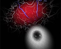 A numerical simulation shows the presence of two prominent vortices, shown in blue, that spontaneously appear in a condensate, shown in red, with other smaller vortices near the boundary of the BEC. The area below the three-dimensional rendering shows what an image of this BEC might look like in an actual experiment, where a laser beam, the white region, shines on a BEC, and the BEC casts a shadow, the dark region, with two bright spots indicating the two main vortices. The grayscale here is reversed from the grayscale used to show the actual experimental images. (University of Queensland/Chris Foster)