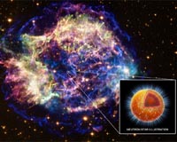 NASA's Chandra X-ray Observatory has discovered the first direct evidence for a superfluid, a bizarre, friction-free state of matter, at the core of a neutron star. Superfluids created in laboratories on Earth exhibit remarkable properties, such as the ability to climb upward and escape airtight containers. The finding has important implications for understanding nuclear interactions in matter a ... read more