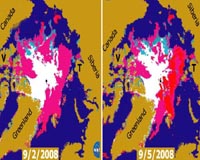 Washington DC (SPX) Sep 12, 2008 There has been considerable interest in the recent state of Arctic sea ice for scientific research and for operational applications especially along the Northern Sea Route and the Northwest Passage. This pair of sea ice maps was derived from radar data from NASA's QuikScat satellite scatterometer on September 2, 2008 (left panel) and September 5, 2008 (right panel). QuikScat's unique features make it a powerful tool for mapping sea ice and accurately identifying sea ice conditions. It can distinguish sea ice from open water, differentiate different classes of ice, and compensate for effects of strong winds on ocean surfaces and effects of melt on ice. In the above images, red areas denote sea ice that was undergoing active melting on the ice surface, magenta areas show sea ice with reduced melt, cyan areas are refrozen sea ice that had some residual wetness from earlier melting, and white areas represent sea ice that had been refrozen for 10 or more days. Ocean areas with less than 15 percent ice cover on the surface are blue, while land surfaces are shown in brown and missing data are depicted in black. Along the coast of Siberia, the Northern Sea Route was blocked by ice in an area northeast of Taymyr Peninsula (denoted by the black "T") on September 2. Just three days later, on September 5, an ocean path was observed in the same area. Warm air transported by northward winds led to extensive areas of active melt (red) over a larger region extending from the Barents Sea across the Kara Sea to the Laptev Sea on September 5. That melt event was so large that some parts of it reached as far north as the vicinity of the North Pole. Along the Canadian north coast, the Northwest Passage was blocked in the Parry Channel north of Victoria Island (denoted by the black "V") on both of these dates, and ice in the small straits south of Victoria Island was slightly reduced on September 5 compared to that on September 2. Very little active melt (red) was observed in the Canadian Arctic Archipelago on both dates. The sea routes may be opened or closed rapidly by transient weather events. Such unstable sea ice conditions in the passages can cause a significant navigation risk. The total sea ice extent in the Arctic at this time was about 0.5 million square kilometers (0.2 mission square miles) larger than that at the same time last year. That difference in sea ice extent amounts to an area the size of Spain. QuikSCAT, managed by JPL, measures ocean surface wind/stress by sending radar pulses to the surface and measuring the strength of the signals returned. Related Links QuikScat mission Earth Observation News - Suppiliers, Technology and Application