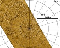 Pasadena CA (SPX) Jan 09, 2008 This synthetic aperture radar image was obtained by the Cassini spacecraft on its recent pass by Titan's south pole on Dec. 20, 2007. This portion of the (T39) swath is of the region extending from about 84 degrees south to the south pole, with a length of approximately 760 kilometers (470 miles) and width of 150 to 170 kilometers (90 to 100 miles). The polar projection of this image is at 128 pixels per degree, or approximately 351 meters per pixel (1,150 feet per pixel), and the radar illumination is from the lower left with incidence angles from about 22 to 38 degrees. This image covers the south pole of Titan, which can be seen as a region of broad smooth valleys surrounded by rugged terrain. Also seen in this image are two features interpreted as lakes, the larger of which may correspond to dark features first identified by the imaging science subsystem in June 2005 (See Land of Lakes?). Their very dark appearance in the radar image indicates that they are probably filled with liquid methane. Other apparently empty lake basins are seen elsewhere in the radar swath. Based on this swath, there appear to be fewer lakes near the south pole than seen in a typical region near the north pole (for example, see Titan's North Polar Region). Since Titan is currently in its late summer season in the southern hemisphere, this interpretation is consistent with a previously proposed theory that methane fills the lakes during the winter and evaporates during the summer, leaving them dry until the next fall. Intensity in this colorized image is proportional to how much radar brightness is returned, or more specifically, the logarithm of the radar backscatter cross-section. The colors are not a representation of what the human eye would see. The lakes, darker than the surrounding terrain, are emphasized here by tinting regions of low backscatter in blue. Radar-brighter regions are shown in tan. Related Links Cassini Explore The Ring World of Saturn and her moons Jupiter and its Moons The million outer planets of a star called Sol News Flash at Mercury