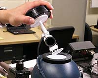 The vertically aligned carbon nanotube samples were mounted in the center of a integrating sphere, which measured the material's reflectivity. Credit: Rensselaer