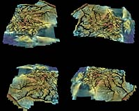 Stereoscopic images from the Descent Imager/Spectral Radiometer (DISR) camera on Huygens have now been analysed and show that some of the ridges between the channels rise to 150 - 200 metres in height, with slopes of thirty degrees. "This is extremely rugged terrain," says Soderblom. The shape suggests that they are drainage channels, cut by liquid methane falling as rain.