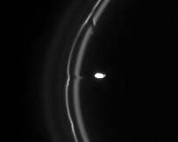 Pasadena CA (JPL) Jul 11, 2007 Prometheus pulls material from the tortured F ring in this highly detailed view. The aftereffects of the moon's other recent encounters with the ring are visible above as dark channels in the inner ringlet. One of two F ring shepherd moons, Prometheus is 102 kilometers (63 miles) across. This view looks toward the unilluminated side of the rings from about seven degrees above the ringplane. The image was taken in visible light with the Cassini spacecraft narrow-angle camera on June 1, 2007 at a distance of approximately 2.1 million kilometers (1.3 million miles) from Prometheus. Image scale is 12 kilometers (8 miles) per pixel. Related Links Cassini at JPL Cassini Image Team Explore The Ring World of Saturn and her moons Jupiter and its Moons The million outer planets of a star called Sol News Flash at Mercury