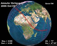 Paris (AFP) Jan 23, 2009 A few lucky people in the Indian Ocean will be treated to a rare event on Monday when an annular solar eclipse will transform the Sun into a dark disc with a blazing ring-shaped corona around its rim. In solar eclipses, the Moon moves between the Sun and Earth, casting its shadow on the terrestrial surface. In an annular eclipse, a tiny shift in distance that results from celestial mechanics means the Moon does not completely cover the Sun's face, as it does in a total eclipse. Instead, for those directly under the alignment, the Moon covers most of the Sun's surface, and a ring-like crown of solar light blazes from the edge of the disk. For those watching from the fringe of the track, the Sun is partially obscured, as if a bite has been taken out of it. According to veteran NASA eclipse-watcher Fred Espenak (http://eclipse.gsfc.nasa.gov/OH/OH2009.html), the total eclipse track will run from west to east on Monday from 0606 GMT to 0952 GMT. It will traverse the Indian Ocean and western Indonesia before petering out just short of Mindanao, the Philippines. The partial eclipse will be seen in a much wider swathe, including the southern third of Africa, Madagascar, Australia, Southeast India, Southeast Asia and Indonesia. It will be the only annular solar eclipse this year. The last was on 7 February, 2007, and after Monday, the next one will be on 15 January, 2010. The big event for eclipse junkies this year is on July 22, when a total solar eclipse will be visible from India and China, the world's two most populous countries. Share This Article With Planet Earth