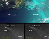 These unique images of the Deepwater Horizon oil slick in the Gulf of Mexico were obtained by the Multi-angle Imaging SpectroRadiometer (MISR) instrument aboard NASA's Terra spacecraft on May 17, 2010, at around 16:40 UTC (11:40 a.m. CDT). The top panel is a false-color image created by combining data from the red band of the 26-degree forward-viewing camera (where the oil appears dark) wi ... read more