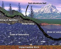 Groundwater resides beneath the soil surface in permeable rock, clay and sand as illustrated in this conceptual image. Many aquifers extend hundreds of feet underground and in some instances have filled with water over the course of thousands of years. Credit: NASA