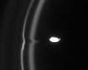 Prometheus pulls material from the tortured F ring in this highly detailed view. The aftereffects of the moon's other recent encounters with the ring are visible above as dark channels in the inner ringlet. One of two F ring shepherd moons, Prometheus is 102 kilometers (63 miles) across.
