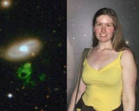 On the right - Hanny van Arkel, the Dutch primary schoolteacher who discovered a mysterious new astronomical object. Credit: Edd Edmondson. On the left - 'Hanny's Voorwerp' : the green blob of gas believed to be a 'light echo' from the bright, stormy centre of a distant galaxy that has now gone dim. Credit : Dan Smith, Peter Herbert, Matt Jarvis and the ING.