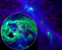 Hamilton, Canada (SPX) Nov 30, 2007 Researchers using supercomputer simulations have exposed a very violent and critical relationship between interstellar gas and dark matter when galaxies are born - one that has been largely ignored by the current model of how the universe evolved. The findings, published today in Science, solve a longstanding problem of the widely accepted model - Cold Dark Matter cosmology - which suggests there is much more dark matter in the central regions of galaxies than actual scientific observations suggest. "This standard model has been hugely successful on the largest of scales-those above a few million light-years-but suffers from several persistent difficulties in predicting the internal properties of galaxies," says Sergey Mashchenko, research associate in the Department of Physics and Astronomy at McMaster University. "One of the most troublesome issues concerns the mysterious dark matter that dominates the mass of most galaxies." Supercomputer cosmological simulations prove that indeed, this problem can be resolved. Researchers modeled the formation of a dwarf galaxy to illustrate the very violent processes galaxies suffer at their births, a process in which dense gas clouds in the galaxy form massive stars, which, at the ends of their lives, blow up as supernovae. "These huge explosions push the interstellar gas clouds back and forth in the centre of the galaxy," says Mashchenko, the lead author of the study. "Our high-resolution model did extremely accurate simulations, showing that this 'sloshing' effect - similar to water in a bathtub- kicks most of the dark matter out of the centre of the galaxy." Cosmologists have largely discounted the role interstellar gas has played in the formation of galaxies and this new research, says Mashchenko, will force scientists to think in new terms and could lead to a better understanding of dark matter. The simulations reported in the research paper were carried out on the Shared Hierarchical Academic Research Computing Network (SHARCNET). Related Links McMaster University Stellar Chemistry, The Universe And All Within It