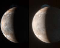 The relatively unprocessed image on the left provides the best view of the volcanic glow and the plume deposits, while the version on the right has been brightened to show the much fainter plume, and the Jupiter-lit night side of Io.