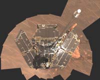 Pasadena CA (JPL) Sep 21, 2007 The skies continue to clear over the Opportunity site, and the dust is falling from both the sky and the rover. The last week was dedicated to evaluating the payload and assessing dust accumulation on the instruments. Fortunately, the solar array energy has improved to over 350 Watt-hours for the last four sols. This has given the vehicle enough power to support two alpha particle X-ray spectrometer integrations and two Mars Express UHF overflights. The team began a campaign to recalibrate the panoramic camera tau observations used to measure the level of atmospheric opacity. The recalibration sequences are designed to run at various times of day to get the sun at different angles in the sky. Each sequence has custom exposure durations and color filters tailored to the intended time of execution. As the team saw last week, the instruments on the robotic arm turret collected a substantial amount of dust during the storm. There are two main concerns: dust inside the alpha particle X-ray spectrometer and dust under the microscopic imager dust cover. On Spirit, dust managed to somehow find its way under the microscopic imager dust cover, so engineers are handling the dust-covered turret on Opportunity with care. Twice in six sols, the team used the front hazard avoidance camera (and the panoramic and navigation cameras) to image the microscopic imager with the dust cover closed. There were two drives between each set of imaging and there is noticeable cleaning between the two. The first of several sky flats images taken with the microscopic imager (dust cover closed) came down today. Preliminary analysis indicates little to no dust on the lens or dust cover. Next week, the team will determine if it is safe to open the dust cover and take images to see if any dust is on the lens itself. The first of two alpha particle X-ray spectrometer integrations was received on the ground today and the initial analysis shows little to no dust contamination. Argon peaks are just as large as before, but additional integrations are necessary to complete the analysis. In the meantime, the team modified the robotic arm ready position to face the alpha particle X-ray spectrometer in towards the vehicle's warm electronics box. The hope is that this will prevent any dust from collecting inside. Sol-by-sol summary: Each sol contained: navigation camera tau at the start of the plan and a Mars Odyssey downlink in the afternoon. Sol 1274: On this sol, the panoramic camera tau measurements were recalibrated. The team moved the robotic arm to place the microscopic imager in view of appropriate cameras for the following images: front hazard avoidance camera of the microscopic imager bore-sight, panoramic camera of MI bore-sight, panoramic camera of microscopic imager side view. Opportunity then finished work with the arm to move to modified ready position with the alpha particle X-ray spectrometer pointed towards the rover. More recalibrations of panoramic camera tau measurements were done before and after the Mars Odyssey pass. Finally, a panoramic camera image of rock target 'Mango' was shot. Sol 1275: The vehicle remained in place due to a sequencing error that precluded the robotic arm from stowing before the planned drive. The uplink team corrected the logic error, and the rover resumed driving at the next opportunity on sol 1278. After the Odyssey pass, more tau recalibrations were conducted. The panoramic camera was also used to survey the horizon and image the sky. Sol 1276: This sol was used to recharge. Some panoramic camera recalibrations were conducted. Sol 1277: More panoramic camera tau measurement recalibrations began this sol. Afterwards, the robotic arm was moved into position to take a panoramic camera image of the microscopic imager from a side view. The panoramic camera took images of the sky. After the Odyssey pass, a tau measurement was taken and the alpha particle X-ray spectrometer was integrated for four hours. There was a Mars Express UHF pass and then Opportunity took a mini-deep sleep. Sol 1278: The first part of this sol was used for more panoramic camera tau recalibrations and panoramic camera mast assembly ("head" and "neck") dust monitoring. The panoramic camera was also used to image the sky. Another recalibration took place before the rover stowed its arm and drove 1.43 meters (4.7 feet) using visodom (visual odometry software) on its closest approach toward the crater rim. Opportunity then conducted post-drive navigation camera images. After the Odyssey pass, more panoramic camera recalibrations were conducted. Sol 1279: On this sol, the microscopic imager, navigation camera and panoramic cameras were all used to image the sky. More recalibrations were conducted before and after the Odyssey pass. The alpha particle X-ray spectrometer was integrated for 5.5 hours. Sol 1280: A panoramic camera tau recalibration was conducted in addition to a panoramic camera tau measurement. The navigation camera took an image. The panoramic camera used its 13 filters to image a bright ripple. Before and after the Odyssey pass, more recalibrations took place. Sol 1281: The first part of this sol was used to conduct a panoramic camera tau recalibration, to monitor dust on the panoramic camera mast assembly and to image the sky with the panoramic camera. The panoramic camera then imaged "Duck Bay." Before and after the Odyssey pass, more recalibrations were conducted. Odometry: As of sol 1279, Opportunity's total odometry is 11,483.39 meters (7.14 miles). Related Links Mars News and Information at MarsDaily.com Lunar Dreams and more