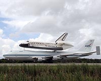 Houston TX (SPX) Sep 22, 2009 One of the pilots for Discovery's 747 Shuttle Carrier Aircraft says today's final leg of the ferry flight presented the most challenging weather situation he's dealt with in the more than 10 cross-country piggyback treks he's flown. The Shuttle Carrier Aircraft arrived at the Shuttle Landing Facility at NASA's Kennedy Space Center in Florida at 12:05 p.m. EDT. Discovery will be detached from the modified jumbo jet during the next 14-18 hours. Tuesday, the shuttle will be towed to Orbiter Processing Facility-3 where the Multi-Purpose Logistics Module Leonardo will be removed from the payload bay and the shuttle will be prepared for its next mission, STS-131. Discovery is targeted for launch to the International Space Station in March 2010. Discovery's 2,500 mile ferry flight began at 9:20 a.m. EDT Sunday after taking off from Edwards Air Force Base in California. The shuttle landed there Sept. 11 to end its STS-128 mission to the space station. The Shuttle Carrier Aircraft made three stops yesterday. Two were refueling stops, one at Rick Husband International Airport in Amarillo, Texas, the other at Ft. Worth Naval Air Station, Texas. The third and final stop Sunday was at Barksdale Air Force Base in Shreveport, La., where Discovery stayed overnight. The ferry flight team departed Barksdale at about 9:40 a.m. EDT and traveled non-stop to Kennedy, maneuvering around storms along the way. Share This Article With Planet Earth
