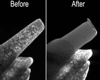 Compression of a nickel pillar whose free end has a diameter of about 150 nanometers. Before compression (left) the pillar has a high density of defects, visible as dark mottling. After compression all the defects have been driven out, a previously unobserved process known as "mechanical annealing."