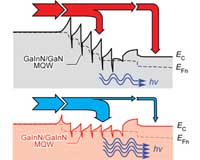 Troy NY (SPX) Jan 21, 2009 Researchers at Rensselaer Polytechnic Institute have developed and demonstrated a new type of light emitting diode (LED) with significantly improved lighting performance and energy efficiency. The new polarization-matched LED, developed in collaboration with Samsung Electro-Mechanics, exhibits an 18 percent increase in light output and a 22 percent increase in wall-plug efficiency, which essentially measures the amount of electricity the LED converts into light. The new device achieves a notable reduction in "efficiency droop," a well-known phenomenon that provokes LEDs to be most efficient when receiving low-density currents of electricity, but then to lose efficiency as higher density currents of electricity are fed into the device. The cause of this droop is not yet fully understood, but studies have shown that electron leakage is likely a large part of the problem. "This droop is under the spotlight since today's high-brightness LEDs are operated at current densities far beyond where efficiency peaks," said project leader E. Fred Schubert, Wellfleet Senior Constellation Professor of Future Chips at Rensselaer, and head of the university's National Science Foundation-funded Smart Lighting Engineering Research Center. "This challenge has been a stumbling block, because reducing the current densities to values where LEDs are more efficient is unacceptable. Our new LED, however, which has a radically re-designed active region, namely a polarization-matched active region, tackles this issue and brings LEDs closer to being able to operate efficiently at high current densities," Schubert said. Results of the study are explained in a paper published online this week by Applied Physics Letters. Focusing on the active region of LEDs where the light is generated, Schubert's team discovered the region contained materials with mismatched polarization. The polarization mismatch likely causes electron leakage, and therefore a loss of efficiency, Schubert said. The researchers discovered that the polarization mismatch can be strongly reduced by introducing a new quantum-barrier design. They replaced the conventional Gallium Indium Nitride/Gallium Nitride (GaInN/GaN) layer of the LED active region, and replaced it with Gallium Indium Nitride/ Gallium Indium Nitride (GaInN/GaInN). This substitution allows the layers of the active region to have a better matched polarization, and in turn reduce both electron leakage and efficiency droop. The benefits seen by testing the new GaInN/GaInN LED were consistent with theoretical simulations showing polarization matching reducing electron leakage and efficiency droop. Schubert expects that a new wave of lighting devices based on LEDs and solid-state lighting will supplant the common light bulb in coming years, leading to vast environmental, energy, and cost benefits as well as innovations in healthcare, transportation systems, digital displays, and computer networking. Along with Schubert, co-authors on the paper include Rensselaer physics, Future Chips, and electrical engineering graduate students Jiuru Xu, Martin F. Schubert, and Ahmed N. Noemaun; Rensselaer Future Chips research assistant Di Zhu; Jong Kyu Kim, research assistant professor of electrical, computer, and systems engineering at Rensselaer; along with Samsung Electro-Mechanics researchers Min Ho Kim, Hun Jae Chung, Sukho Yoon, Cheolsoo Sone, and Yongjo Park. Share This Article With Planet Earth