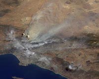 Smoke from the Station fire is seen covering the interior valleys along the south side of the San Gabriel Mountains, along with parts of the City of Los Angeles and Orange County, and can be seen drifting for hundreds of kilometers to the east over the Mojave Desert.