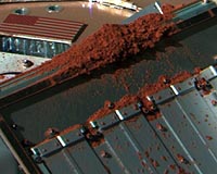 Phoenix's robotic arm delivered soil Thursday from a trench informally named "Rosy Red" through a narrow opening to a screen above the No. 5 oven on the lander's Thermal and Evolved-Gas Analyzer (TEGA). A few particles of the sample passed through the screen on Thursday, but not enough to fill the oven and allow analysis of the sample to begin.