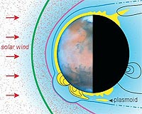 Science@NASA Huntsville AL (SPX) Nov 25, 2008 Researchers have found new evidence that the atmosphere of Mars is being stripped away by solar wind. It's not a gently continuous erosion, but rather a ripping process in which chunks of Martian air detach themselves from the planet and tumble into deep space. This surprising mechanism could help solve a longstanding mystery about the Red Planet. "It helps explain why Mars has so little air," says David Brain of UC Berkeley, who presented the findings at the 2008 Huntsville Plasma Workshop on October 27th. Billions of years ago, Mars had a lot more air than it does today. (Note: Martian "air" is primarily carbon dioxide, not the nitrogen-oxygen mix we breathe on Earth.) Ancient martian lake-beds and river channels tell the tale of a planet covered by abundant water and wrapped in an atmosphere thick enough to prevent that water from evaporating into space. Some researchers believe the atmosphere of Mars was once as thick as Earth's. Today, however, all those lakes and rivers are dry and the atmospheric pressure on Mars is only 1% that of Earth at sea-level. A cup of water placed almost anywhere on the Martian surface would quickly and violently boil away-a result of the super-low air pressure. So where did the air go? Researchers entertain several possibilities: An asteroid hitting Mars long ago might have blown away a portion of the planet's atmosphere in a single violent upheaval. Or the loss might have been slow and gradual, the result of billions of years of relentless "sand-blasting" by solar wind particles. Or both mechanisms could be at work. Brain has uncovered a new possibility--a daily ripping process intermediate between the great cataclysm and slow erosion models. The evidence comes from NASA's now-retired Mars Global Surveyor (MGS) spacecraft. In 1998, MGS discovered that Mars has a very strange magnetic field. Instead of a global bubble, like Earth's, the Martian field is in the form of magnetic umbrellas that sprout out of the ground and reach beyond the top of Mars' atmosphere. These umbrellas number in the dozens and they cover about 40% of the planet's surface, mainly in the southern hemisphere. For years, researchers thought the umbrellas protected the Martian atmosphere, shielding pockets of air beneath them from erosion by the solar wind. Surprisingly, Brain finds that the opposite can be true as well: "The umbrellas are where coherent chunks of air are torn away." Addressing his colleagues at the Workshop, he described how he made the discovery just a few months ago: Brain was scrolling through archival data from Global Surveyor's particles and fields sensors. "We have measurements from 25,000 orbits," he says. During one of those orbits, MGS passed through the top of a magnetic umbrella. Brain noticed that the umbrella's magnetic field had linked up with the magnetic field in the solar wind. Physicists call this "magnetic reconnection." What happened next is not 100% certain, but Global Surveyor's readings are consistent with the following scenario: "The joined fields wrapped themselves around a packet of gas at the top of the Martian atmosphere, forming a magnetic capsule a thousand kilometers wide with ionized air trapped inside," says Brain. "Solar wind pressure caused the capsule to 'pinch off' and it blew away, taking its cargo of air with it." Brain has since found a dozen more examples. The magnetic capsules or "plasmoids" tend to blow over the south pole of Mars, mainly because most of the umbrellas are located in Mars' southern hemisphere. Brain isn't ready to declare the mystery solved. "We're still not sure how often the plasmoids form or how much gas each one contains." The problem is, Mars Global Surveyor wasn't designed to study the phenomenon. The spacecraft was only equipped to sense electrons, not the heavier ions which would make up the bulk of any trapped gas. "Ions and electrons don't always behave the same way," he cautions. Also, MGS sampled the umbrellas at fixed altitudes and at the same local time each day. "We need to sample many altitudes and times of day to truly understand these dynamic events." In short, he told the audience, "we need more data." Brain is pinning his hopes on a new NASA mission named MAVEN. Short for "Mars Atmosphere and Volatile Evolution," MAVEN is an upper atmosphere orbiter currently approved for launch to Mars in 2013. The probe is specifically designed to study atmospheric erosion. MAVEN will be able to detect electrons, ions and neutral atoms; it will be able to measure both magnetic and electric fields; it will travel around Mars in an elliptical orbit, piercing magnetic umbrellas at different altitudes, angles, and times of day; and it will explore regions both near and far from the umbrellas, giving researchers the complete picture they need. If magnetized chunks of air are truly being torn free, MAVEN will see it happening and measure the atmospheric loss rate. "Personally, I think this mechanism is important," says Brain, "but MAVEN may yet prove me wrong." Meanwhile, the Mystery of the Missing Martian Air is shaping up to be a ripping good yarn. Share This Article With Planet Earth