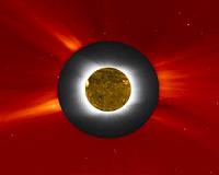 A solar eclipse photo (gray and white) from the Williams College Expedition to Easter Island in the South Pacific (July 11, 2010) was embedded with an image of the Sun's outer corona taken by the Large Angle Spectrometric Coronagraph (LASCO) on the SOHO spacecraft and shown in red false color. LASCO uses a disk to blot out the bright sun and the inner corona so that the faint outer corona ... read more