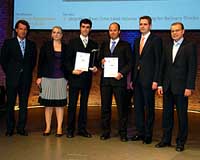 Dr Jurgen Anke and Dr Mario Neugebauer from the Germany company ubigrate GmbH came up with an intelligent solution named LoVoTrack to use satellites to allot lorry capacity better, and won the T-Systems/DHL prize at the European Satellite Navigation Competition 2008, backed by ESA's Technology Transfer Programme. From left: Thorsten Rudolph (Managing Director of Anwendungszentrum GmbH Oberpfaffenhofen, organiser of the European Satellite Navigation Competition), Ulrike Daniels (Project Manager at Anwendungszentrum GmbH Oberpfaffenhofen), Jurgen Anke (ubigrate GmbH), Mario Neugebauer (ubigrate GmbH), Ralf Nejedl (Head of Galileo Programme at T-Systems) and Dr Keith Ulrich (Head of DHL Innovation Center). Credits: ESA