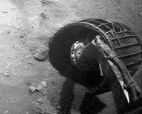 This three-frame animation aids evaluation of performance of the right-front wheel on NASA's Mars Exploration Rover Spirit during a drive on the rover's 2,117th Martian day, or sol (Dec. 16, 2009). Image credit: NASA/JPL-Caltech - Full size gif image