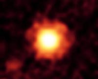 NASA's Spitzer Space Telescope captured this infrared image of a giant halo of very fine dust around the young star HR 8799, located 129 light-years away in the constellation Pegasus. The brightest parts of this dust cloud (yellow-white) likely come from the outer cold disk similar to our own Kuiper belt (beyond Neptune's orbit). The huge extended dust halo is seen as orange-red. Astronomers think that the three large planets known to orbit the star are disturbing small comet-like bodies, causing them to collide and kick up dust. The extended dust halo has a diameter of about 2,000 astronomical units, or 2,000 times the distance between Earth and the sun. For reference, the size of Pluto's orbit is tiny by comparison, with a diameter of about 80 astronomical units. This image was captured by Spitzer's multiband imaging photometer at an infrared wavelength of 70 microns in Jan. 2009. Image Credit: NASA/JPL-Caltech/Univ. of Ariz.