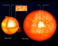 Artist's impression of the structure of a solar-like star and a red giant. The two images are not to scale - the scale is given in the lower right corner. It is common to divide the Sun's (and solar-like stars') interior into three distinct zones: The uppermost is the Convective Zone. It extends downwards from the bottom of the photosphere to a depth of about 15% of the radius of the Sun. Here the energy is mainly transported upwards by (convection) streams of gas. The Radiative Zone is below the convection zone and extends downwards to the core. Here energy is transported outwards by radiation and not by convection. From the top of this zone to the bottom, the density increases 100 times. The core occupies the central region and its diameter is about 15% of that of the entire star. Here the energy is produced by fusion processes through which hydrogen nuclei are fused together to produce helium nuclei. In the Sun, the temperature is around 14 million degrees. In red giants, the convection zone is much larger, encompassing more than 35 times more mass than in the Sun. + See larger images and caption details at ESO