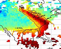 A plume of excess electron density over North America on Nov. 20, 2003. The plume was discovered and mapped by its effect on GPS signals. Credit: Courtesy of Anthea Coster and John Foster of MIT.