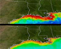 These images show how ocean color changes from summer (top) to winter (bottom) in the Gulf of Mexico. They were created from the Moderate Resolution Imaging Spectroradiometer (MODIS) instrument that flies about NASA's Aqua satellite. Reds and oranges represent high concentrations of phytoplankton and river sediment.Credit: Goddard SVS