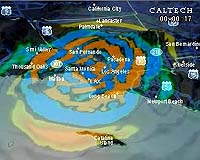 The waiting ShakeMovie system at Caltech collects these seismic recordings automatically over the Internet. Then, for events greater than magnitude 3.5, to fill in the gaps between the actual ground motion recorded at specific locations in the region, the scientists use the recorded data to guide a computer model that creates a "virtual earthquake," giving an overall view of the ground motion throughout the region.