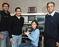 From left, electrical engineering graduate students Yogesh Ramadass, Naveen Verma and Joyce Kwong, along with Professor Anantha Chandrakasan. This team has developed a microchip that can be up to 10 times more energy-efficient than present technology. Photo Donna Coveney