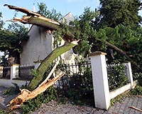 A tree, broken down on the roof of a church by strong winds, is pictured on July 24, 2009, in Lutogniew near Krotoszyn. At least seven people have died in Poland and the Czech Republic and dozens were injured after heavy storms and torrential rain felled trees, electricity poles and ripped off roofs. Photo courtesy AFP