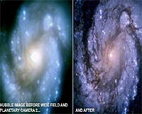 On Thursday Jan 13, 1994, NASA released its first images from the new Hubble. Among them a "before and after" picture taken of spiral galaxy M100. The difference in picture quality was startling. The picture would appear the next day in papers around the world. It was taken by the Wide field and Planetary Camera 2. It indicated to the American people and the world that "the trouble with Hubble" was now over.