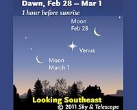 Venus And Crescent Moon Pair Up At DawnLos Angeles CA (SPX) Feb 23, 2011 The brightest planet and the eerie waning crescent Moon will create an arresting sky scene low in the southeast in the early dawn of Monday, February 28th, and Tuesday, March 1st, 2011. "These are the two brightest astronomical objects in the sky after the Sun," says Alan MacRobert, a senior editor of Sky and Telescope magazine. "They'll certainly catch your eye, if you look low in the sou ... read more |