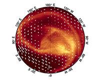 The new analysis also reveals that the centre of rotation of the vortex drifts right around the pole over a period of 5-10 Earth days. Its average displacement from the geographical South Pole is about three degrees of latitude, or several hundred kilometres. The data show no evidence of any link between the positions of these 'centroids' and local solar times, as might result from a solar tide-related forcing of the superrotation.