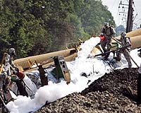 Lviv (AFP) Jul 18, 2007Toxic fumes threatened thousands of residents in western Ukraine on Tuesday after a freight train derailed and caught fire, causing mass evacuations and leaving at least 21 people injured. Authorities were urging residents to use gas masks and remain inside as yellow clouds of highly toxic phosphorus hung over the area. |