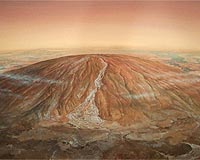 An artist's impression of Ganesa Macula, a mountain on Saturn's moon Titan believed to be an "ice volcano" that periodically belches "lava" containing liquid water. Research by University of Arizona graduate student Catherine Neish suggests this water may react with organic compounds in Titan's atmosphere to create complex molecules similar to those on the early Earth. Credit: Michael Carroll