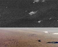 Cassini radar sees sand dunes on Saturn's giant moon Titan (upper photo) that are sculpted like Namibian sand dunes on Earth (lower photo). The bright features in the upper radar photo are not clouds but topographic features among the dunes. Image credit: NASA/JPL - upper photo; NASA/JSC - lower photo.
