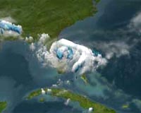NASA's TRMM spacecraft observed this view of Tropical Storm Fay on August 20, 2008 at 0345Z as it crossed Florida. At this time the storm sustained winds of 45 knots (52 mph) and a pressure reading of 990 millibars. The storm stalled in this location for 24 hours and brought over 24 inches of rain to Eastern Florida. The cloud cover is taken by TRMM's Visible and Infrared Scanner(VIRS) and the GOES spacecraft. The rain structure is taken by TRMM's Tropical Microwave Imager (TMI) and TRMM's Precitation Radar(PR) instruments. TRMM looks underneath of the storm's clouds to reveal the underlying rain structure. Blue represents areas with at least 0.25 inches of rain per hour. Green shows at least 0.5 inches of rain per hour. Yellow is at least 1.0 inches of rain and red is at least 2.0 inches of rain per hour. To observe the full animation of Tropical Storm Fay please go here