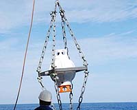 Anchoring of the PACT bottom unit during the RV Poseidon expedition 360, on Nov. 5, 2007, north of the Canary Islands. The PACT bottom unit was deployed at 3100 meter depth in 2km horizontal distance from the MARUM-operated permanent fixture. The PACT surface unit, receiving, storing and transmitting acoustic telegrams, is attached to the MARUM fixture at approximately 10m depth. Credit: Develogic