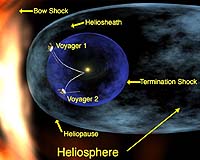Iowa City IO (SPX) Jul 03, 2008 Two University of Iowa space physicists report that the Voyager 2 spacecraft, which has been traveling outward from the Sun for 31 years, has made the first direct observations of the solar wind termination shock, according to a paper published in the July 3 issue of the journal Nature. At the termination shock the solar wind, which continuously expands outward from the sun at over a million miles per hour, is abruptly slowed to a subsonic speed by the interstellar gas. Don Gurnett, professor of physics in the College of Liberal Arts and Sciences and principal investigator for the plasma wave instrument on Voyager 2, and Bill Kurth, UI research scientist and Voyager co-investigator, said that the shock crossing was marked by an intense burst of plasma wave turbulence detected by the UI instrument, as well as by various effects detected by other instruments on the spacecraft. At the time of the shock crossing, August 31, 2007, Voyager 2 was at a distance of 83.7 astronomical units (AU), roughly twice the distance between the Sun and Pluto. At this great distance, it took 11.2 hours for the radio signal from the spacecraft to reach Earth. Shock waves in the thin, ionized gas -- called plasma -- that exists in space are similar in some respects to the shock waves produced by an airplane in supersonic flight. Shock waves in space are believed to play an important role in the acceleration of cosmic rays, which are very energetic atomic particles that continually bombard Earth. The most energetic cosmic rays, which are potentially hazardous to astronauts, are believed to be produced in intense shock waves caused by supernova explosions -- immense stellar explosions that occur in massive stars toward the end of their lives. The termination shock is believed to be responsible for the origin of less energetic cosmic rays called "anomalous cosmic rays." The recent observations at the termination shock are expected to help physicists understand how cosmic rays are produced by the turbulent fields that exist in such shocks. Gurnett said,"There is no way for us to make direct measure of a super nova shock, so the Voyager 2 measurements at the termination shock provide us the best opportunity in the foreseeable future to understand how cosmic rays are produced by supernova cosmic shocks." Kurth noted that while some aspects of the termination shock matched scientists expectations, a number of the observations made by Voyager were surprising and will cause a number of theories to be revised. Gurnett noted that Voyager 2, launched in 1977, is moving at a speed of 38,000 miles an hour. Even at this considerable speed, the spacecraft will still take 30,000 years to reach a distance equal to that of the nearest star. Related Links Sounds of Voyager's encounter with shock waves Solar Science News at SpaceDaily